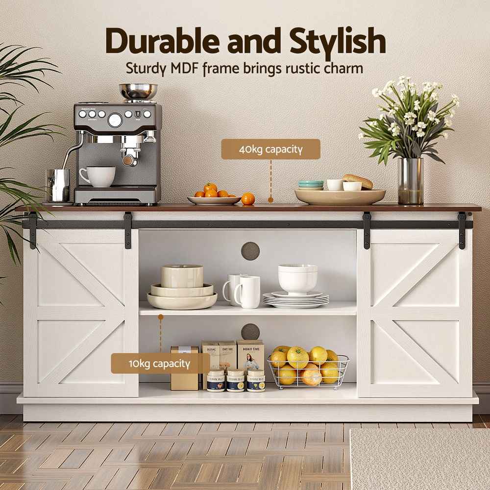 Upgrade your home with this 150cm rustic storage cabinet, designed to blend timeless farmhouse charm with modern functionality. Crafted with a sturdy MDF frame and smooth sliding barn doors, this sideboard offers both durability and effortless style, making it the perfect addition to your living room, bedroom, hallway, or office.