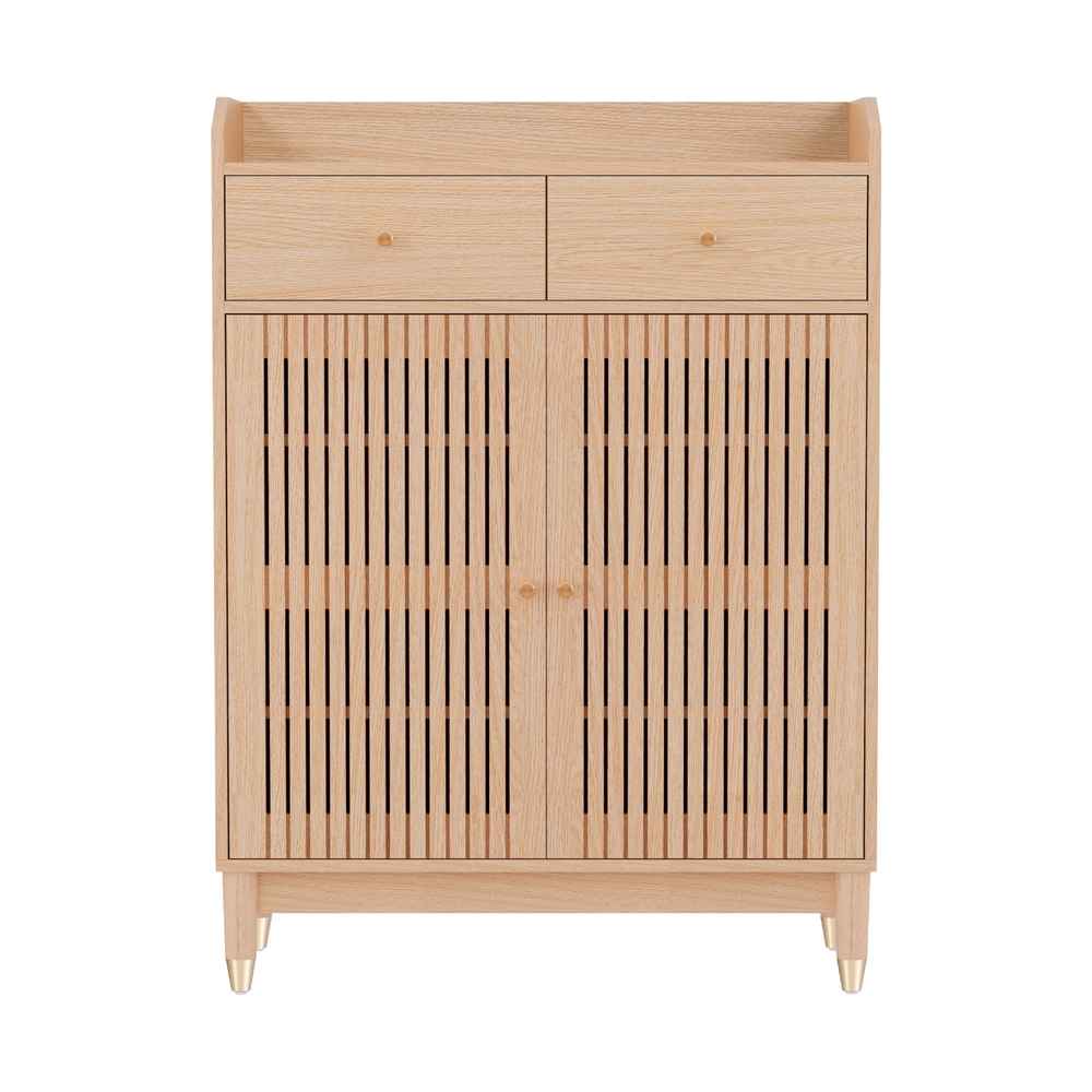Crafted from particle board with a paper veneer finish, this shoe rack is easy to clean and built for everyday use. Ventilated doors promote airflow to help reduce odours, while solid pine wood legs with metal caps provide stability and a refined finish.